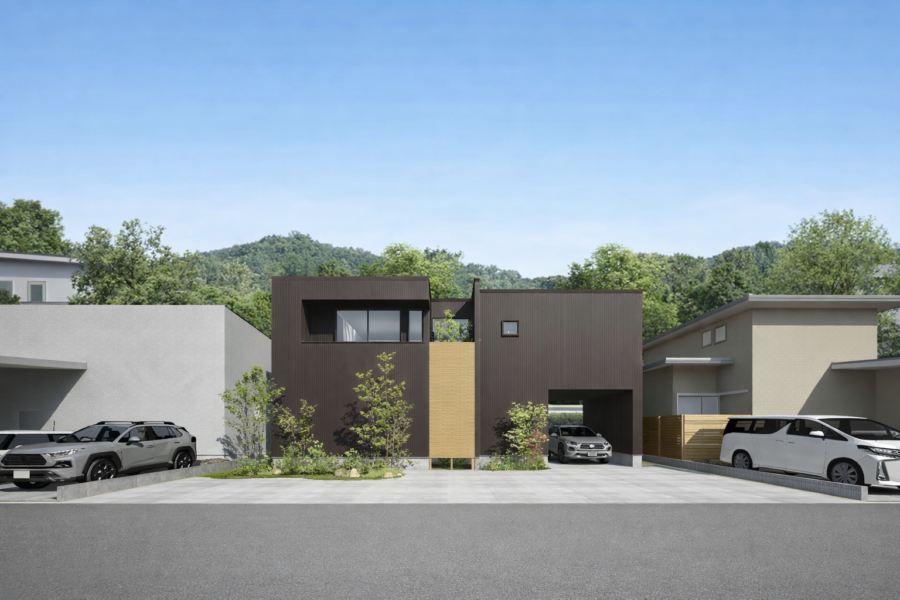 住宅地にたたずむ美術館かカフェのようなお家。玄関を入ると広い土間が現れ、導かれるようにリビングへ進むと、グレーを基調に効き色のブラックが点在するスタイリッシュな空間が広がる。夜のライトアップで外観の雰囲気はがらり。フォルムの美しさが一層引き立つ。