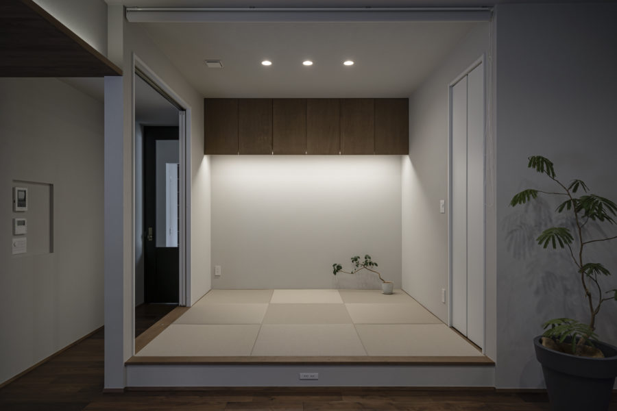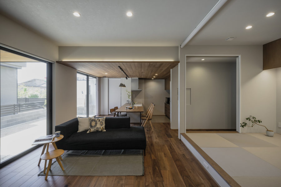 リビングと畳スペースを緩やかな段差で仕切り、多用途に使えるレイアウト。窓からの光と間接照明で奥行きを感じる住まいです。