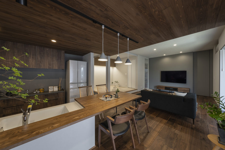 天井から床まで木目で統一し、落ち着いた雰囲気を演出。ペンダント照明が手元を明るく照らし、会話が弾むダイニングを形づくります。