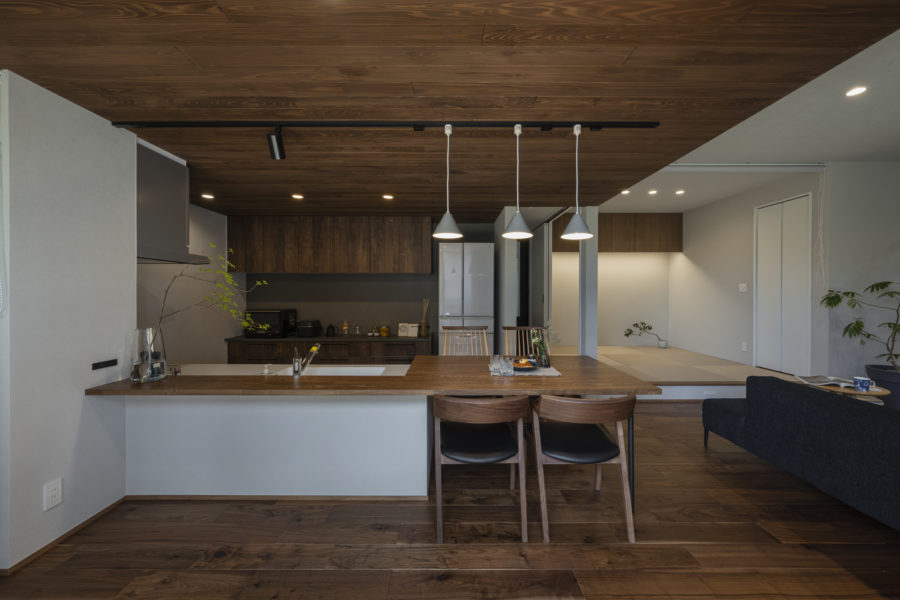 キッチンからリビング、畳スペースまで見渡せる間取り。家族の気配を感じながら安心して過ごせる設計です。