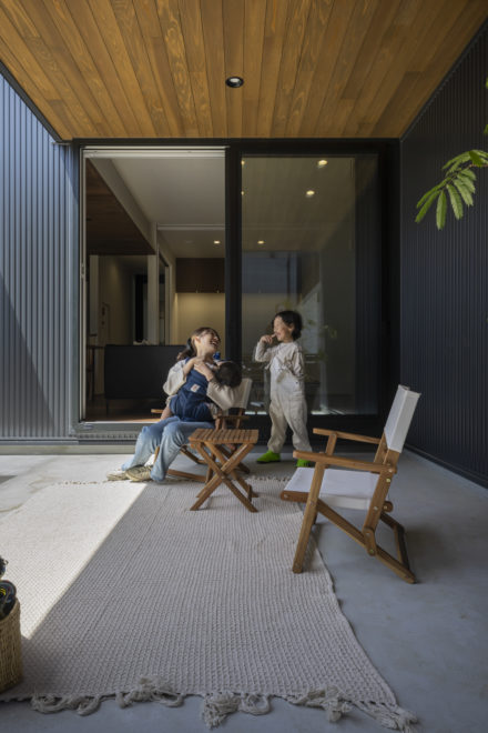 外からの視線を気にせず過ごせる中庭。リビングとつながる開放感があり、家族の時間を自然に外へ広げます。